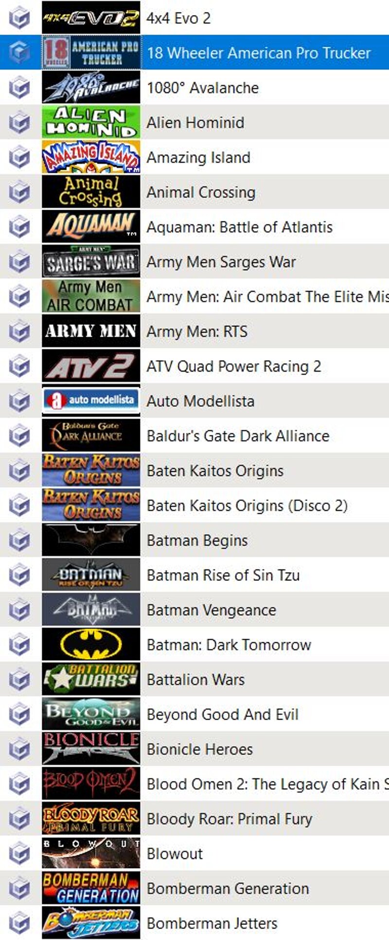 4x4 Evo 2 (USA)"18 Wheeler"1080 Avalanche (En,Fr,De,Es,It"alien-hominid-usa"amazing-island-usa"Animal Crossing (Europe) (En,Fr,De,Es,It)"Ant Bully, The (USA) (En,Fr)"Aquaman - Battle for Atlantis (USA)"Army Men - Air Combat - The Elite Missions (USA).nkit"Army Men - RTS (USA).nkit"Army Men - Sarge's War (USA)"ATV - Quad Power Racing 2 En,Fr,De,Es,It)"Auto Modellista (USA)"Baldur's Gate - Dark Alliance ITA"Baten Kaitos Origins (USA)"Batman - Dark Tomorrow (Europe) (En,Fr,De,Es,It)"Batman - Rise of Sin Tzu (Europe) (En,Fr,De,Es,It)"Batman - Vengeance (Europe) (En,Fr,De,Es,It)"Batman Begins (USA)"Battalion Wars ITA"Battle Stadium D.O.N (NTSC-J)"Beyond Good & Evil (De,It NO PC"Bionicle Heroes (USA)"Bleach Tasogare Ni Mamieru Shinigami"Blood Omen 2 - The Legacy of Kain Series"Bloody Roar - Extreme (Japan)"Bloody Roar - Primal Fury"Blowout (USA)"Bomberman Generation"Bomberman Jetters (USA)"Bomberman Land 2 (Japan)"Burnout (Europe) (En,Fr,De,Es,It)"Burnout 2 - Point of Impact (Europe) (En,Fr,De,Es,It)"Bust-A-Move 3000 (USA)"Call of Duty - Finest Hour"Call of Duty 2 Big Red One (Italy)"CAPCOM VS. SNK 2 EO"CaptainTUBASA"Casper Spirit Dimensions (En,Fr,De,Es,It"CATWOMAN (En,Fr,De,Es,It"Cel Damage (Europe)"Chaos Field (USA"Charlie and The Chocolate Factory"Charlie's Angels (Europe) (En,Fr,De)"chibi-robo-plug-into-adventure-usa"City Racer (USA)"Codename - Kids Next Door - Operation - V.I.D.E.O.G.A.M.E. (USA)"Conan En,Fr,De,Es,It)"Conflict - Desert Storm II - Back to Baghdad (USA)"Crash Bandicoot The Wrath of Cortex ita"Crash Nitro Kart (Europe)"Crash Tag Team Racing (Europe, Australia)"crazy-taxi-europe"Cubivore - Survival of the Fittest (USA)"CuriousGeorge"Dakar 2 - The World's Ultimate Rally (USA) (En,Fr,De,Es,It)"Darkened Skye (Europe) (En,Fr,De)"DEAD TO RIGHTS En,Fr,Es,It"Defender"Die Hard - Vendetta ITA"Digimon Rumble Arena 2 (Europe) (En,Fr,De,Es"Disney's Donald Duck Phantomias - Platyrhynchos Kineticus (En,Fr,De,Es,It)"Disney's Donald Duck - Quack Attack (Europe) (En,Fr,De,Es,It)"Disney's Magical Mirror Starring Mickey Mouse (Europe) (En,Fr,De,Es,It)"DONKEY KONG JUNGLE BEAT ita"dora-the-explorer-journey-to-the-purple-planet-europe"Dragon Ball Z - Sagas (USA)"Dragon Ball Z Budokai (Europe) (En,Fr,De,Es,It"Dragon Ball Z Budokai 2 ita"Dragon's Lair 3D - Return to the Lair (USA)"dr-muto-usa"Ed, Edd n Eddy - The Mis-Edventures (USA"Egg Mania - Eggstreme Madness (USA) (Rev 1)"Enter the Matrix (Europe) (En,Fr,De,Es,It) (Disc 1)"Eternal Darkness - Sanity's Requiem (Europe) (En,Fr,De,Es,It)"evolution-worlds-europe"F1 2002 En,Fr,De,It)"Fairly OddParents, The - Shadow Showdown"Fantastic 4 (Europe"FIFA Street 2 (Europe) (En,Fr,De)"Fire Emblem Path of Radiance (En,Fr,De,Es,It)"Forbidden DoR Beta 1.1"Freaky Flyers (USA)"Freedom Fighters (Europe)"Frogger Ancient Shadow [GFPEA4] [232FFDD4][b]"Frogger Beyond ita"Frogger's Adventures - The Rescue (USA)"Future Tactics - The Uprising (Europe) (En,Fr,De,Es,It)"F-Zero GX (Europe) (En,Fr,De,Es,It)"Gauntlet - Dark Legacy"Geist (Europe) (En,Fr,De,Es,It)"Generation of Chaos Exceed - Yami no Koujo Roze (Japan)"Gladius (Europe) (En,Es,It no pc"Goblin Commander"Godzilla - Destroy All Monsters Melee (Europe) (En,Fr,De,Es,It)"Grooverider - Slot Car Thunder (USA)"GT Cube (Japan)"Gun (Europe) (En,Fr,Es,It)"GUNDAM1"Harry Potter and the Chamber of Secrets (Europe) (Es,It,Pt)"Harry Potter and the Goblet of Fire (Europe"Harry Potter and the Prisoner of Azkaban (Europe)"Harvest Moon - A Wonderful Life (Europe)"Harvest Moon - Magical Melody (USA)"Haunted Mansion (USA)"Hikaru no Go 3 (Japan"Hitman 2 - Silent Assassin (Europe"Hudson Selection Vol. 1 - Cubic Lode Runner (Japan)"Hudson Selection Vol. 3 - PC Genjin - Pithecanthropus Computerurus (Japan)"Hudson Selection Vol. 4 - Takahashi-Meijin no Boukenjima (Japan)"ikaruga-europe"Incredible Hulk, The - Ultimate Destruction (Europe) (En,Es,It)"I-Ninja (USA)"Intellivision Lives! (USA"International Superstar Soccer 3 En,Fr,De,Es,It"Italian Job, The (Europe) (En,Fr,De,Es,It)"JAMES BOND Agent Under Fire"James Bond 007(tm) NightFire ITA"JAMES BOND Everything or Nothing ita"JAMES BOND From Russia with Love (Europe)"JAMES BOND GoldenEye Rogue Agent En,It,Nl,Sv"Jimmy Neutron Jet Fusion"Kao the Kangaroo - Round 2 (Europe) (En,Fr,De,Es,It)"Killer7 (Europe) (En,Fr,De"King Arthur En,Fr,De,Es,It)"King Kong the Movie En,Fr,De,Es,It,Nl,Sv,No,Da,Fi"Kirby Air Ride ITA"Knights of the Temple - Infernal Crusade (Europe) (En,Fr,De,Es)"Lara Croft Tomb Raider - Legend"Largo Winch - Empire Under Threat (Europe) (En,Fr,De,Es,It)"Legend of Spyro, The - A New Beginning (Europe) (En,Fr,De,Es,It,Nl)"Legend of Zelda, The - Collector's Edition (Europe) (En,Fr,De,Es,It)"Legend of Zelda, The - Four Swords Adventures (Europe) (En,Fr,De,Es,It)"Legend of Zelda, The - Ocarina of Time & Master Quest (Europe) (En,Fr,De)"Legend of Zelda, The - The Wind Waker (Europe) (En,Fr,De,Es,It)"LEGO Star Wars II The Original Trilogy"Lego STAR WARS THE VIDEO GAME"Looney Tunes - Back in Action (Europe) (En,Fr,De,Es,It"Lord of the Rings, The - The Third Age NO PC"Lost Kingdoms II (Europe) (En,Fr,De)"Lotus Challenge"Luigis Mansion ITA"Lupin III - Umi ni Kieta Hihou (Japan) (Disc 1)"Madagascar (Italy"Mario Kart - Double Dash!! (Europe) (En,Fr,De,Es,It)"Mario Party 4 (Europe) (En,Fr,De,Es,It) (v1.02)"Mario Party 5 (En,Fr,De,Es,It)"Mario Party 6 ITA"Mario Party 7 ITA"Mario Power Tennis (Europe) (En,Fr,De,Es,It)"Mario Smash Football (Europe) (En,Fr,De,Es,It)"Mario Superstar Baseball (Europe)"MarioGolf Toadstool Tour ITA"Marvel Nemesis - Rise of the Imperfects (Europe)"Medal of Honor - European Assault"Medal of Honor - Rising Sun (Europe) (En,Es,It,Nl,Sv"Meet the Robinsons (USA)"Mega Man Anniversary Collection"Mega Man X - Command Mission (Europe) (En,Fr,De"MEGAMAN NETWORK TRANSMISSION"mega-man-x-collection-usa"Men In Black II Alien Escape ITA"Metal Arms - Glitch in the System"Metal Gear Solid - The Twin Snakes (Europe) (En,Fr,De,Es,It)"Metroid Prime (Europe) (En,Fr,De,Es,It)"Micro Machines IT
